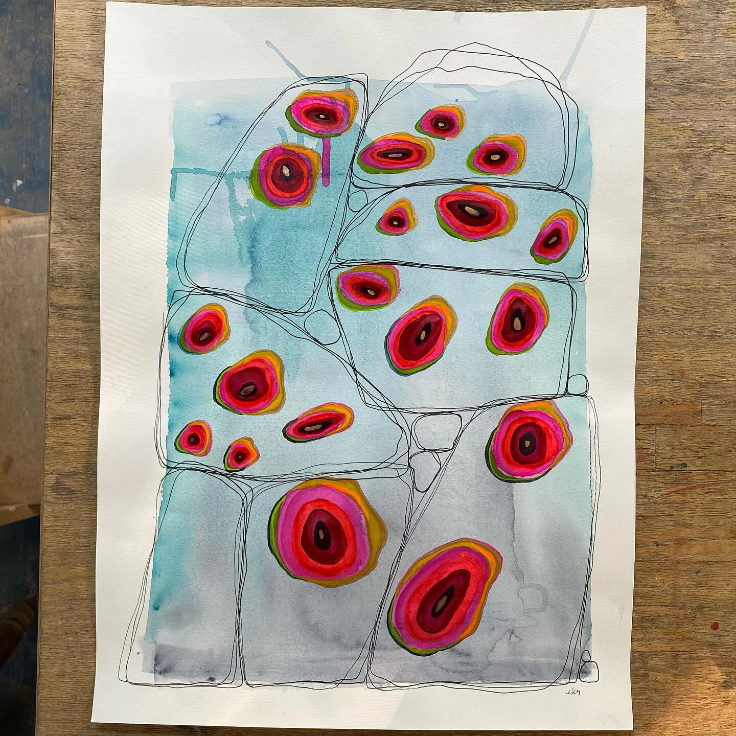 Watercolor and ink painting series, “Marking My Way” explores the contrast and pairing of haphazard growth with intentionally built structure. Also known as the flowers and cairns series.